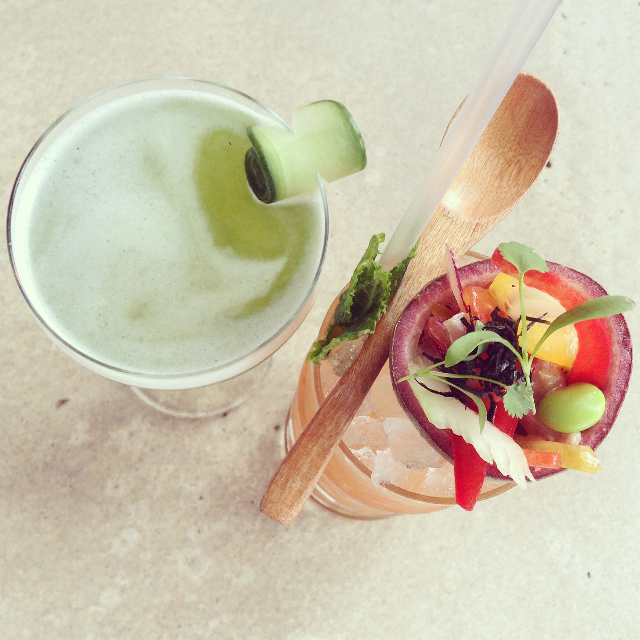 Stunning presentation of the Coconut Ceviche and Chucumber cocktail.
